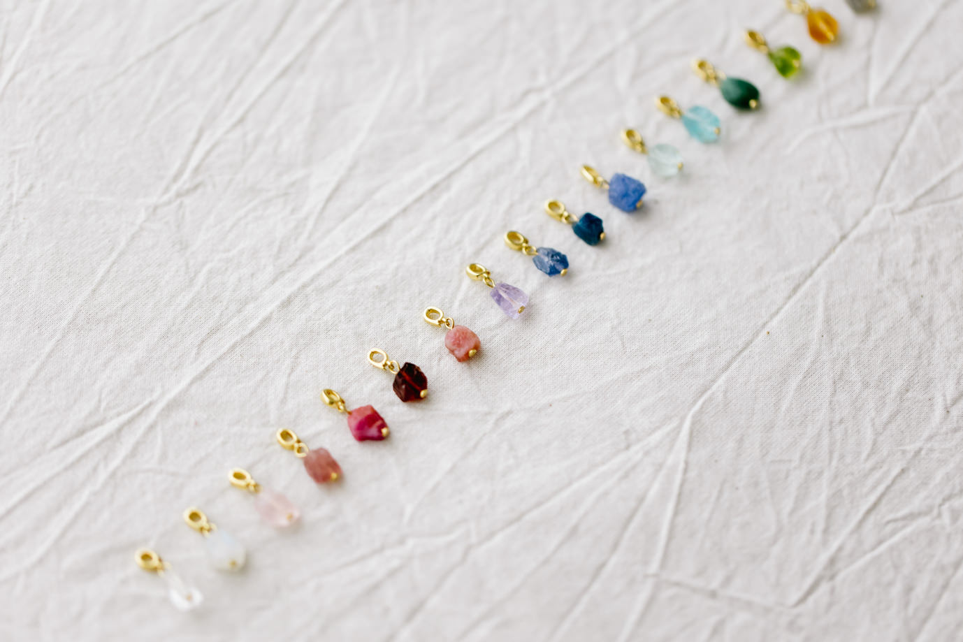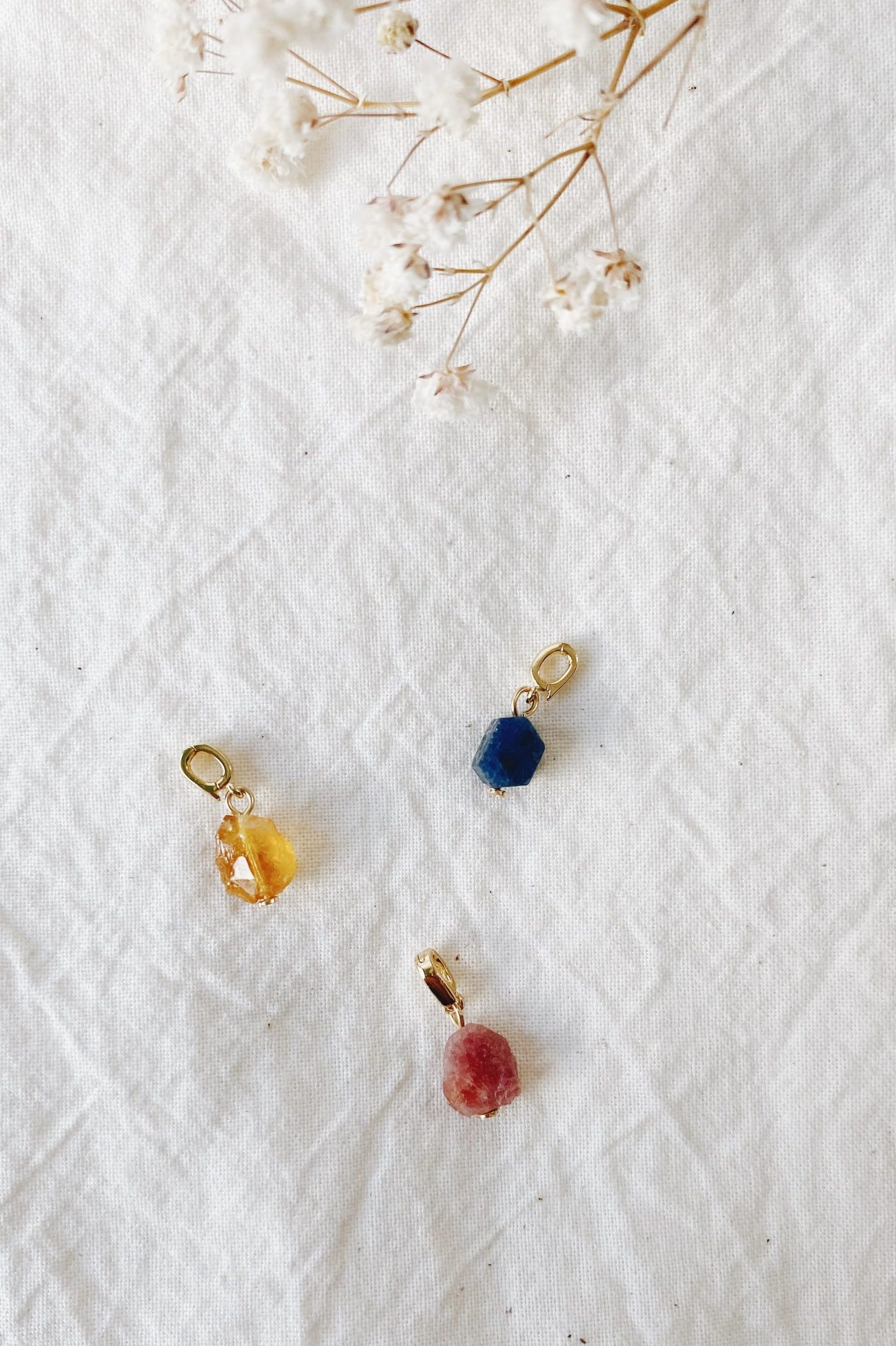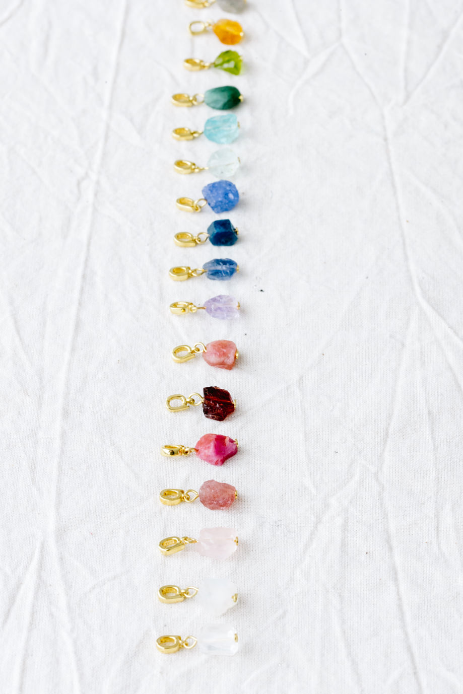 Hemos diseñado estos charms en nuestras piedras preciosas y semipreciosas favoritas. 17 minerales distintos para elegir que hemos utilizado en su formato más puro, al natural, sin talla ni pulido, tal y como las encontraríamos en el interior de la tierra.