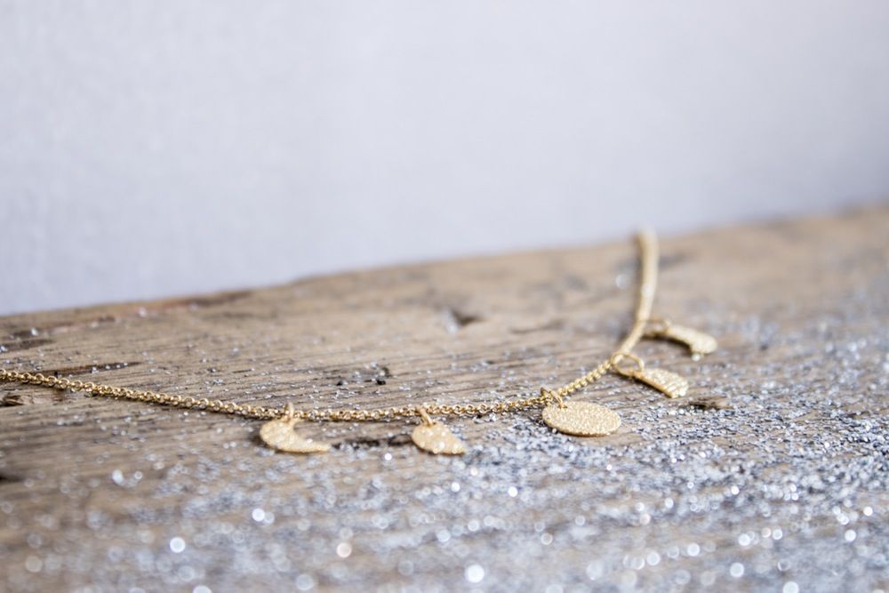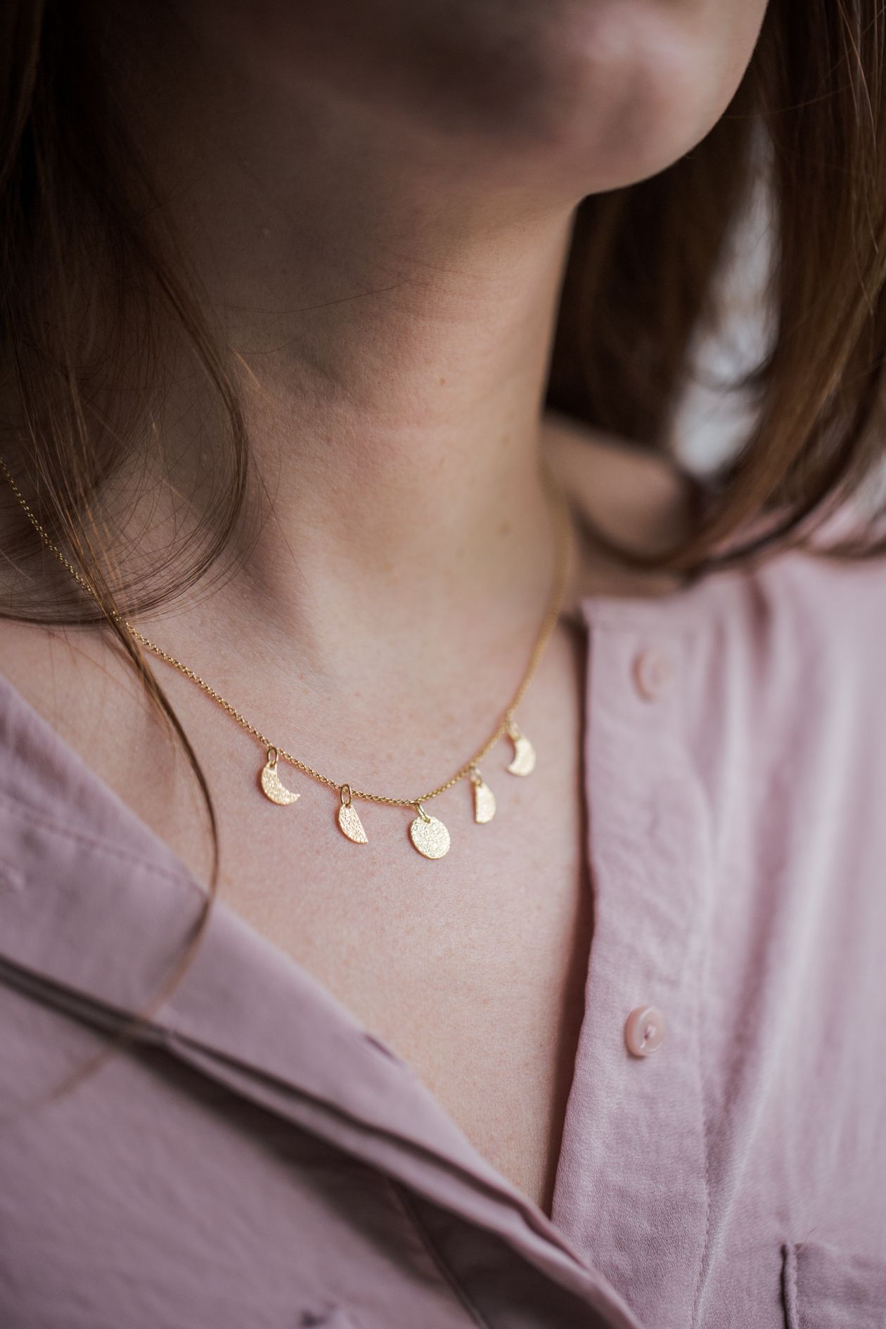 Una pieza en la que hemos estado trabajando durante mucho tiempo, mimando cada detalle. Las lunas de este collar están fabricadas especialmente para nosotros siguiendo nuestro propio diseño y acabadas en una textura especial que las hace más delicadas. Tanto las lunas como el resto de componentes de este collar se fabrican en España. El collar mide 43cm de largo, es completamente libre de níquel y plomo y está disponible en Latón chapado en oro 18kt o en Plata 925.