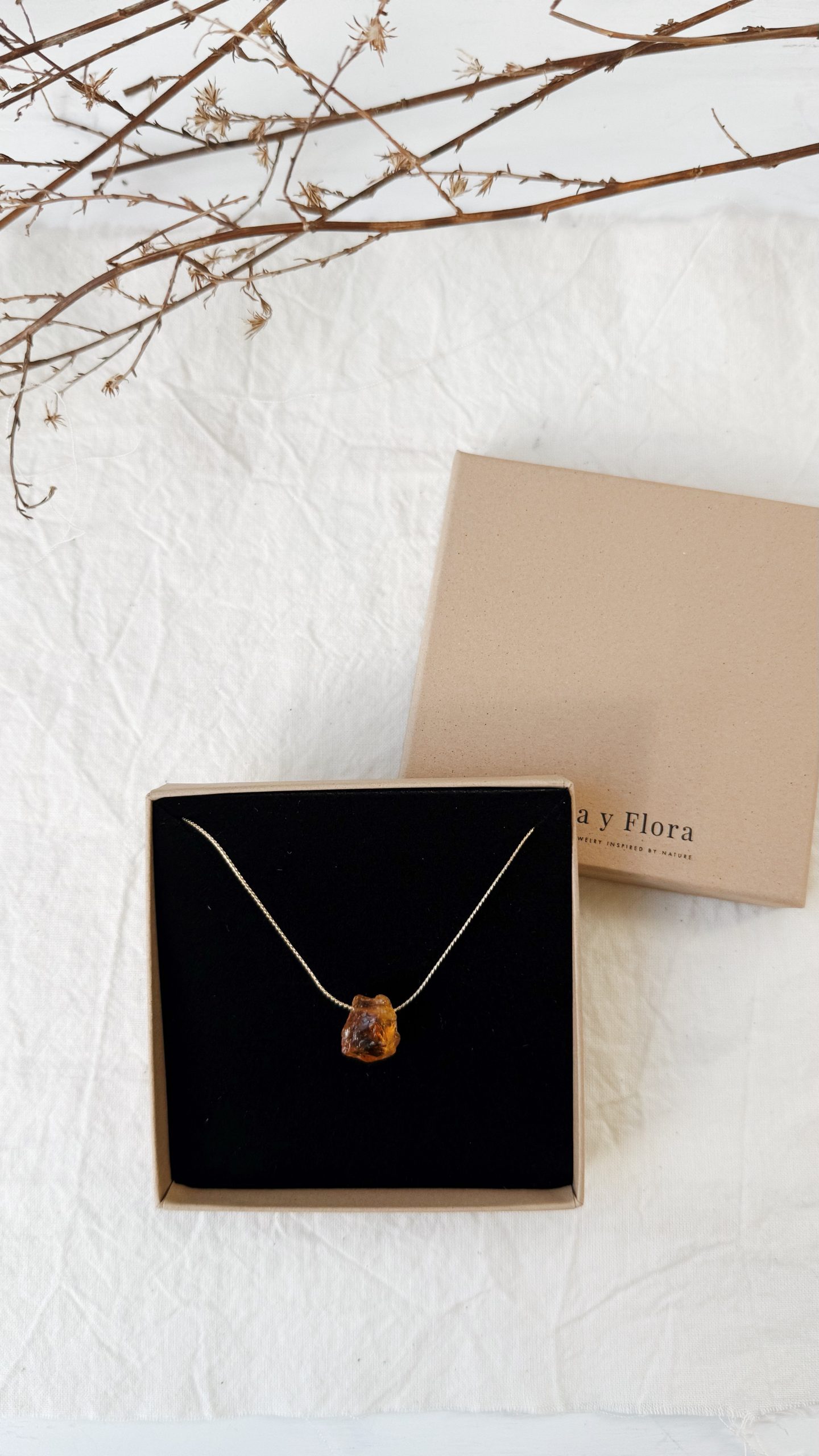 La piedra -que se muestra al natural, tal y como la encontraríamos en el interior de la tierra- va montada en una cadenita fina de 4ocm de latón chapado en oro de 18kt, libre de níquel y plomo.
