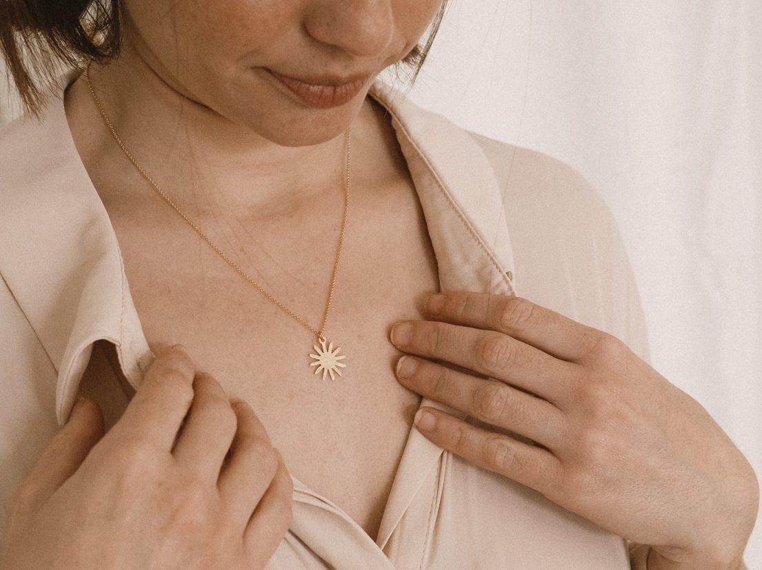 Este colgante en forma de Sol es un pequeño amuleto luminoso para los tiempos oscuros. Una pieza llena de buena energía que podrá acompañarte en cualquier ocasión.