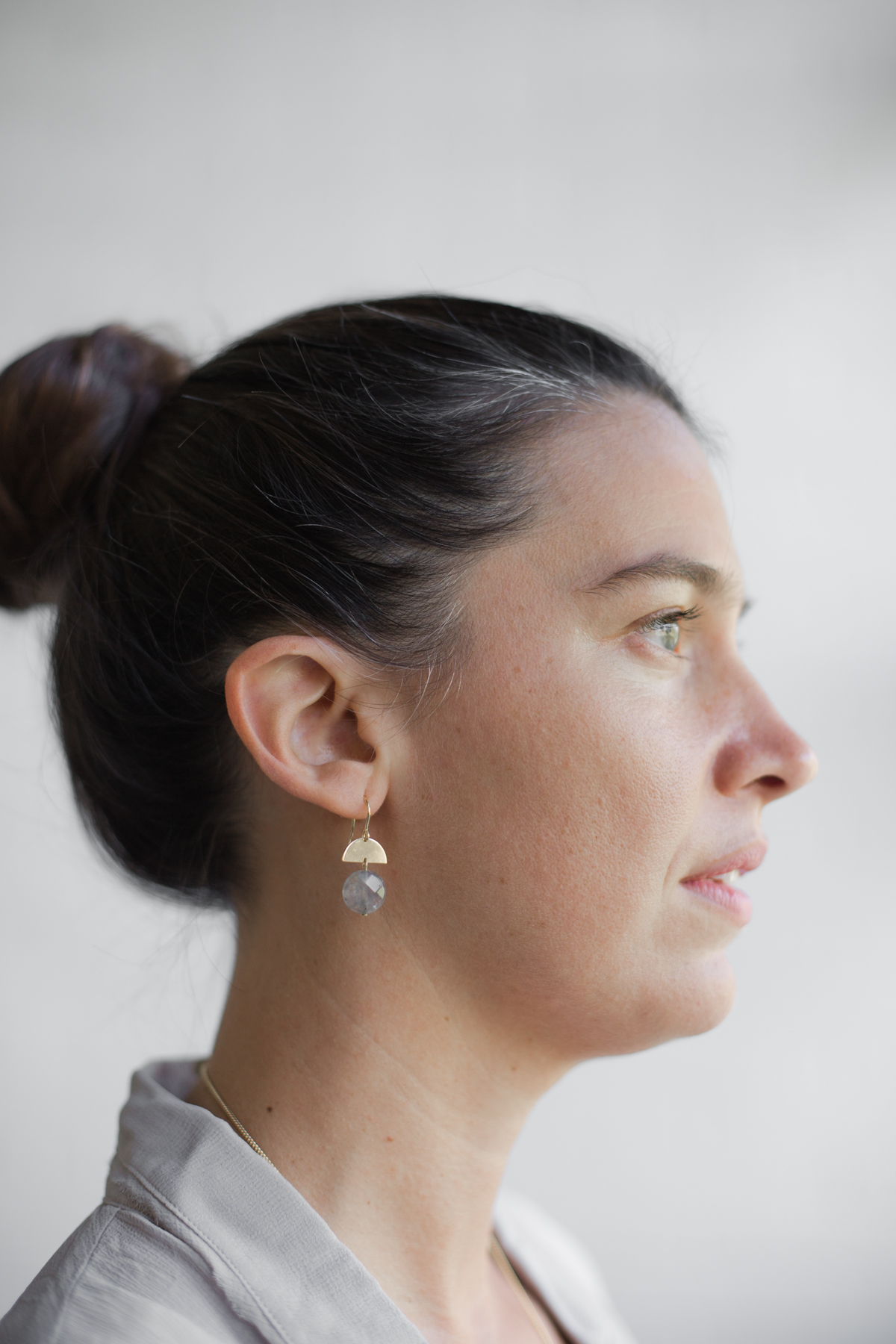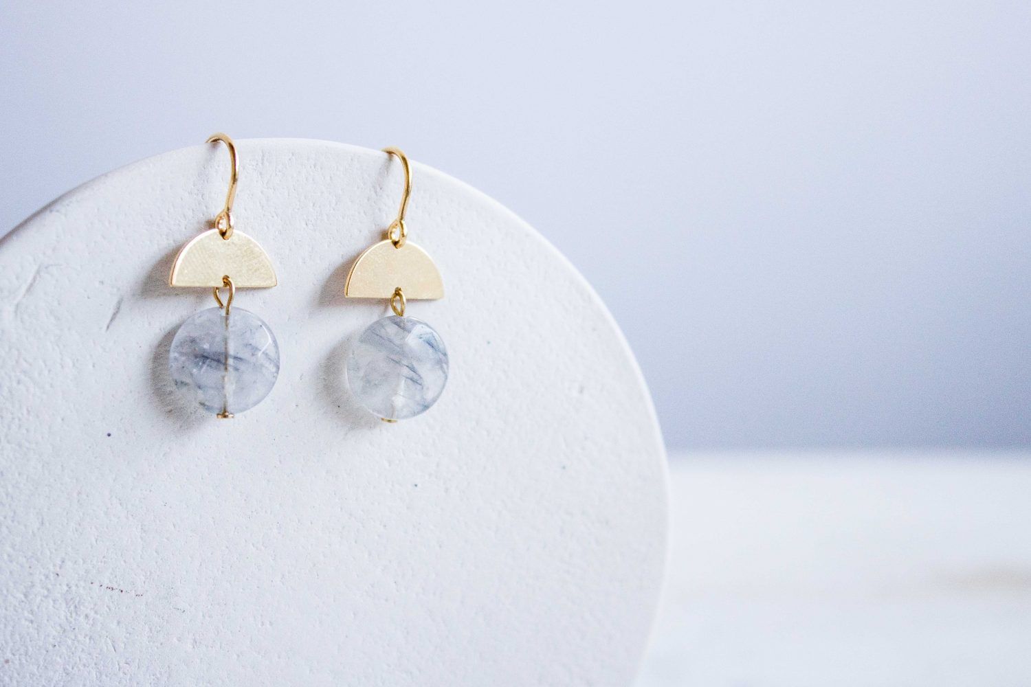 Los pendientes Celeste están formados por un semicírculo de latón que combina con un círculo facetado de Cuarzo nublado (tonos grises) que es como una luna cubierta por nubes.